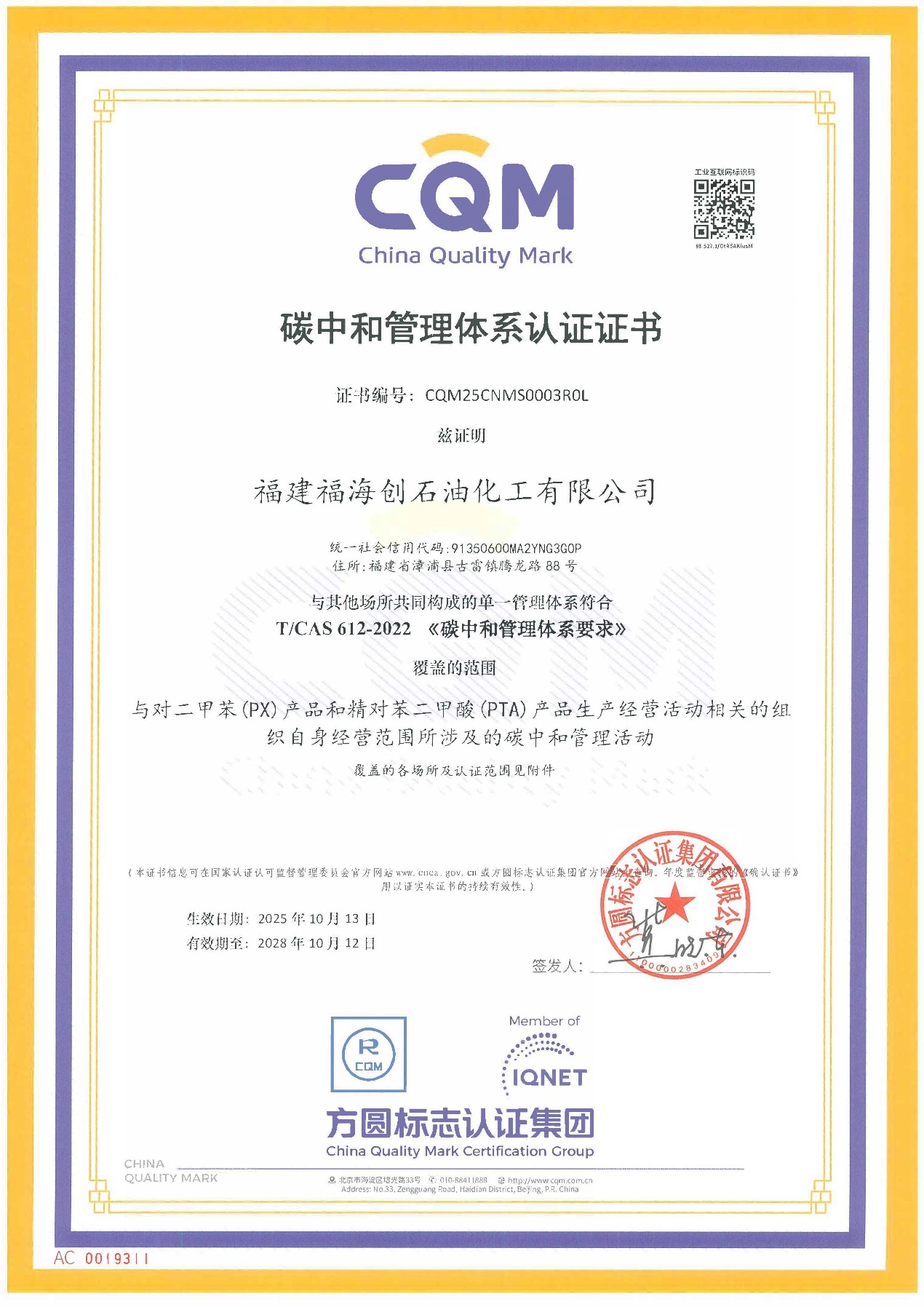 10月13日,福海创顺利通过权威机构认证审核,成功荣获福建省化工行业首张“碳中和管理体系”认证证书。这一重要成果标志着公司在绿色低碳转型道路上迈出关键步伐,也为同行业探索碳中和管理提供了可参考的实践案例。